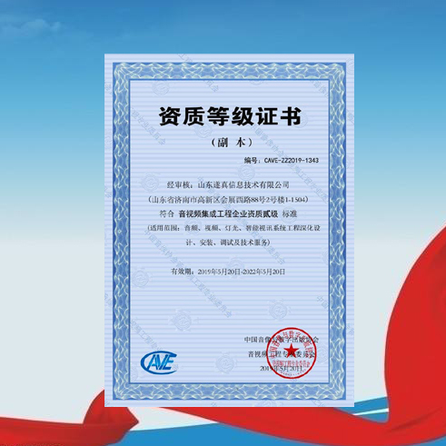 公司獲得中國(guó)音像協(xié)會(huì)音視頻工程專業(yè)委員會(huì)頒發(fā)的《音視頻集成工程企業(yè)資質(zhì)貳級(jí)》證書,成為省內(nèi)首批通過(guò)該權(quán)威機(jī)構(gòu)認(rèn)證的二級(jí)資質(zhì)企業(yè)。